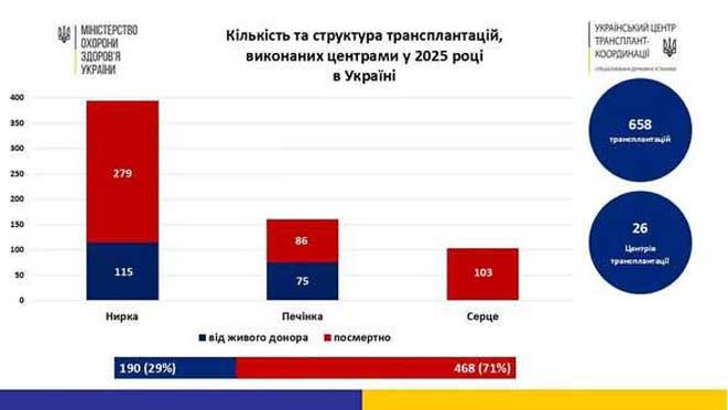 Наразі розвиток системи привів до того, що трансплантації стали рутинними. За минулий рік у 26 центрах медики виконали 658 органних пересадок, тоді як у 2024 році їх було 516. Найбільше таких операцій провели у Першому медичному об’єднанні Львова (154), Національному науковому центрі хірургії та трансплантології імені О. О. Шалімова (105) та у Київській міській клінічній лікарні № 1 (91). Найбільшу кількість трансплантацій серця виконано в Інституті серця (63), печінки — у клініці «Оберіг» (57), а нирок — у Першому медичному об’єднанні Львова (109).